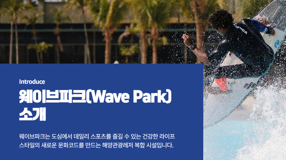 서핑, 다이빙을 즐길 수 있는 웨이브파크입니다. 일상 속 특별한 재미를 웨이브파크에서 느낄수 있습니다.