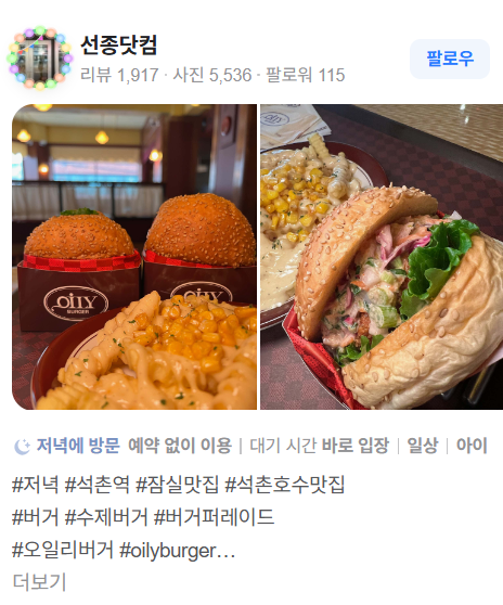📌 복합문화,주거,관광지, 잠실의 중심에서 만나는 오일리버거
