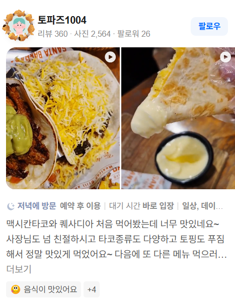 - “타코, 브리또, 퀘사디아 다 기대 이상. 멕시코 음식 처음인데도 부담 없이 먹었다.”