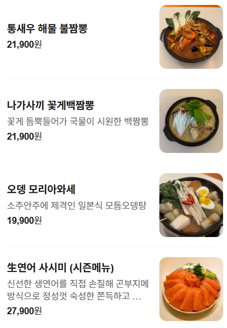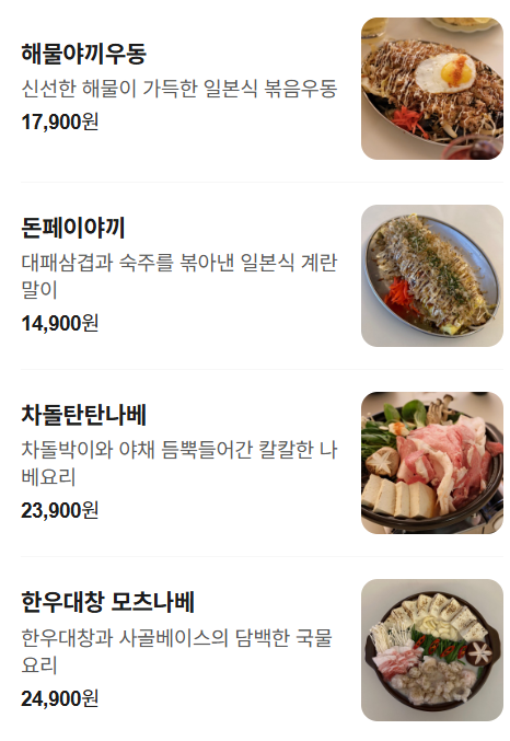 - 차돌 탄탄나베: 국물 요리 메뉴로 추운 날이나 술자리 안주로 인기.