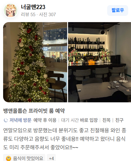 분위기를 중요하게 여기는 커플 데이트, 친구 모임, 특별한 날 방문에 잘 어울리며, 와인과 식사가 어우러진 감각적인 경험을 원하는 분들에게 추천드려요.