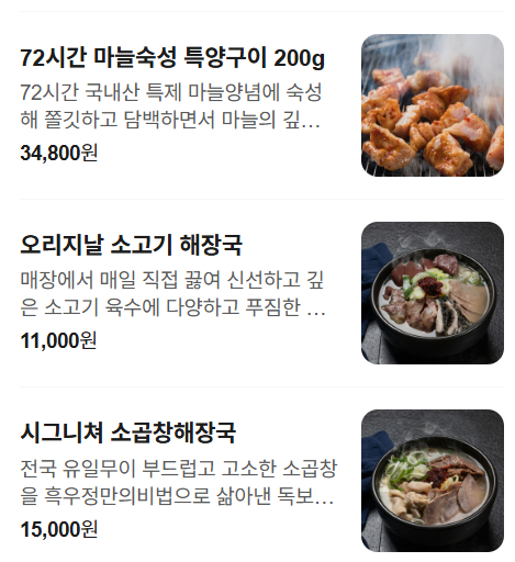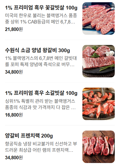 - 양념 갈비 / 생등심 / 채끝살 – 부드러운 식감과 풍부한 육즙