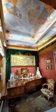 갤러리의 인테리어는 고풍스러운 느낌을 주며, 아늑한 소파와 장식적인 테이블이 배치되어 있어 편안하게 앉아 작품을 감상할 수 있는 공간이 마련되어 있습니다.