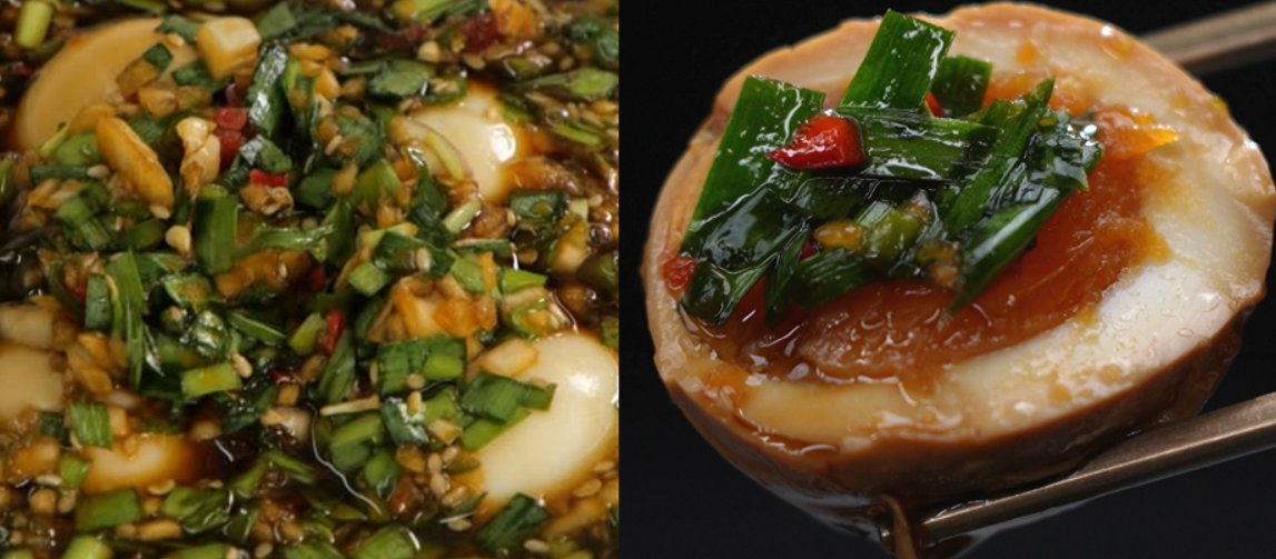 2. 껍질을 깐 반숙란을 부추 짜박이 안에 넣어주면 완성!