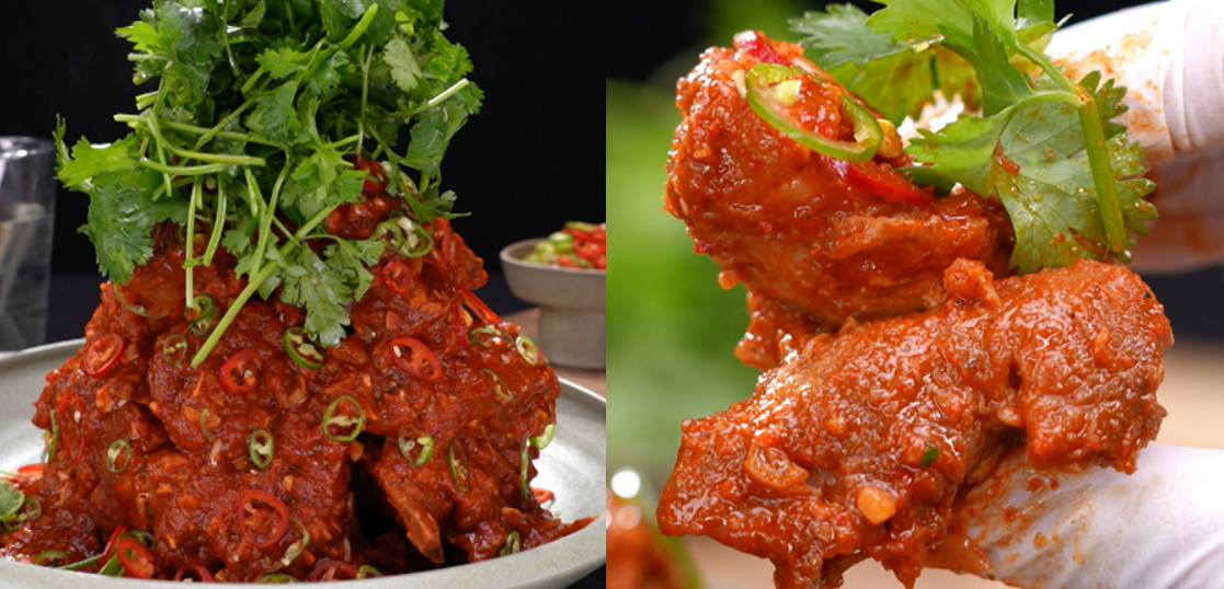 9. 완성된 뼈찜을 그릇에 탑처럼 쌓아 담고, 썰어둔 고추와 고수를 듬뿍 올려주면 완성!