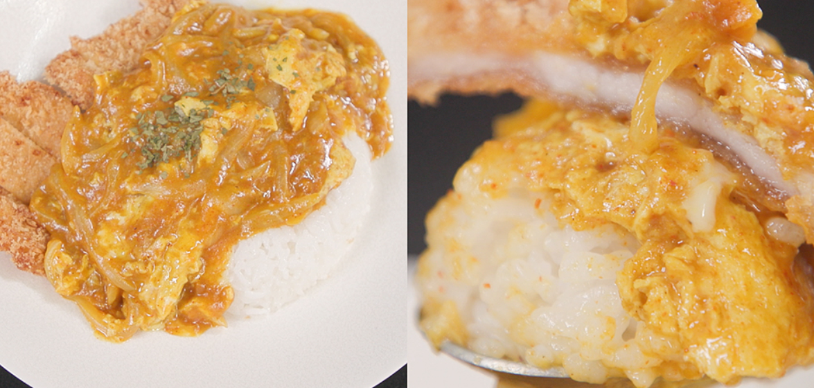 5. 접시에 밥, 썬 돈가스를 올린 뒤, 위에 매콤한 카레 소스를 덮는다.