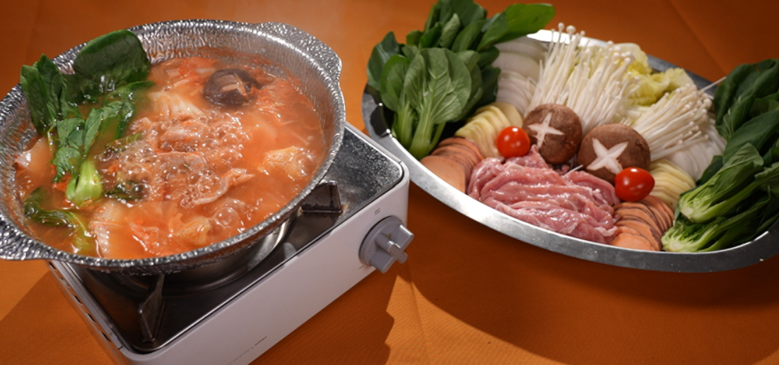 돼지고기 생 목살 샤브샤브용 400g, 고구마 1개, 감자 1개, 청경채 2개, 무 1/3개, 알배추 1/2개, 팽이버섯 1개, 표고버섯 2개