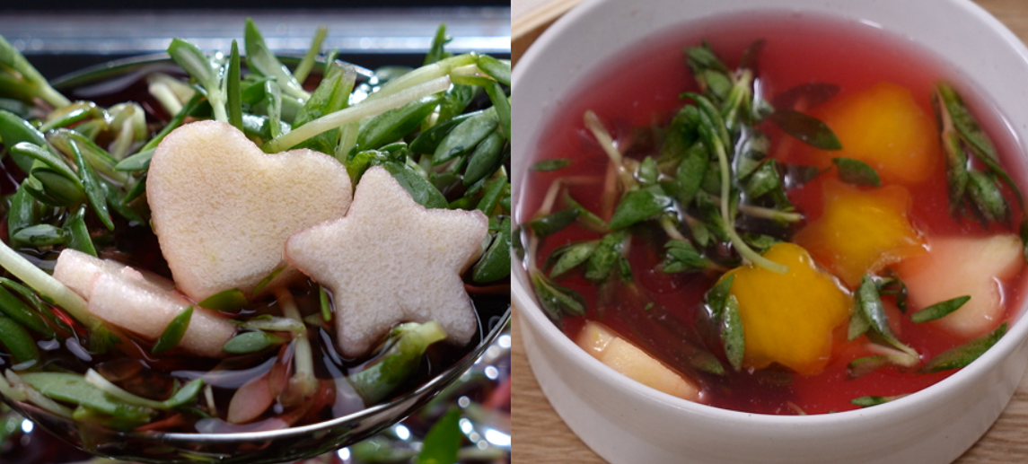 - 비트 김칫국물에 돌나물 4줌과 파프리카&사과 고명을 넣으면 완성
