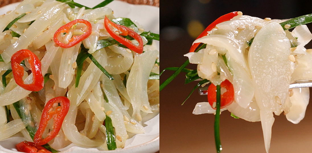 1. 찜기에 채 썬 양파를 넣고 뚜껑 닫고 강불로 10분 찐 다음, 체에 밭쳐 물기를 뺀다.