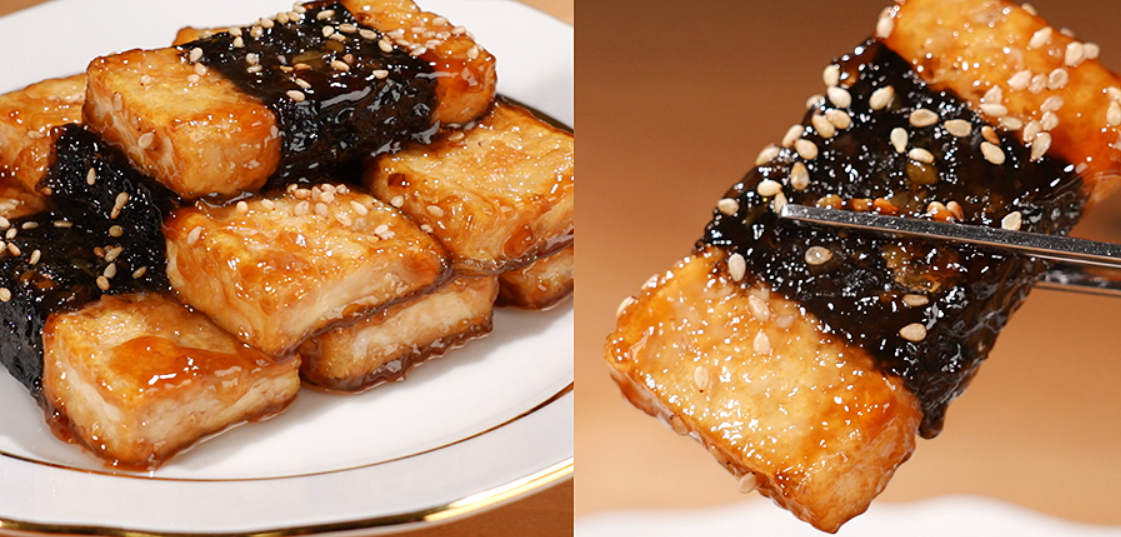 2. 김밥용 김은 길게 3 등분하고, 두부를 김밥용 김으로 감싼다.