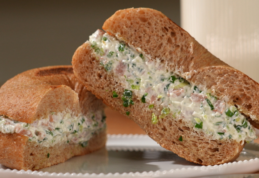 베이글, 버터, 그릭요구르트 100g, 쪽파 6줄기, 스팸 1/2캔(50g), 설탕 1/2t, 소금 1/2t, 후추 4바퀴