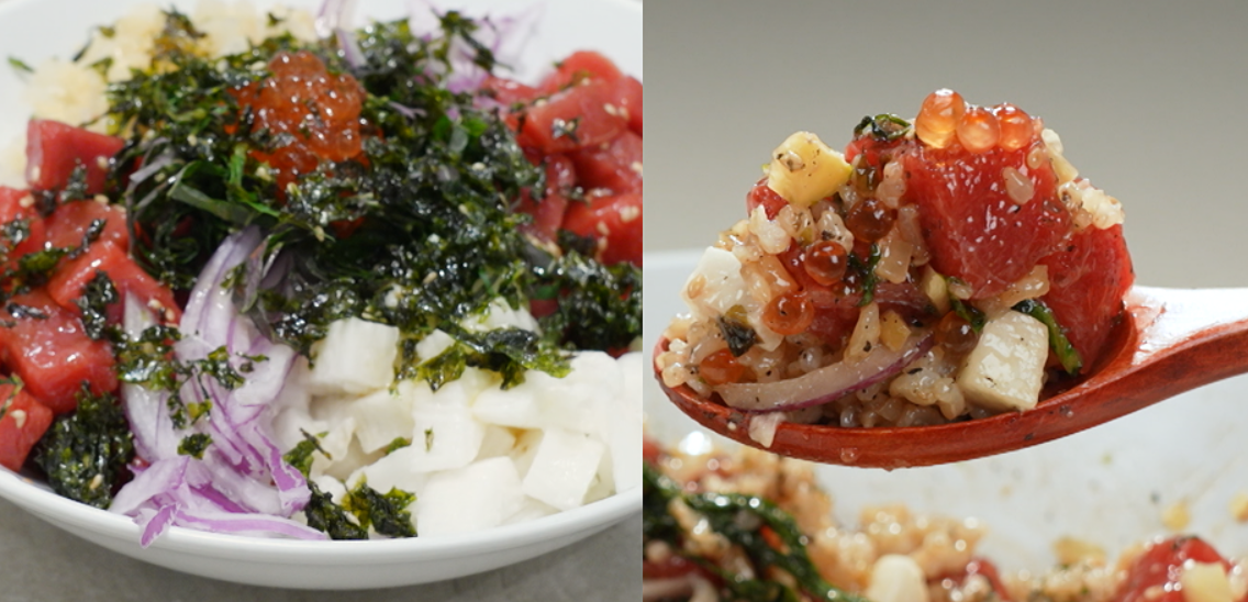 현미밥 200g, 참치회 300g, 단무지 30g, 마 80g, 깻잎 4장, 자색양파 소량, 연어알 간장절임, 김자반, 깨, 검은깨