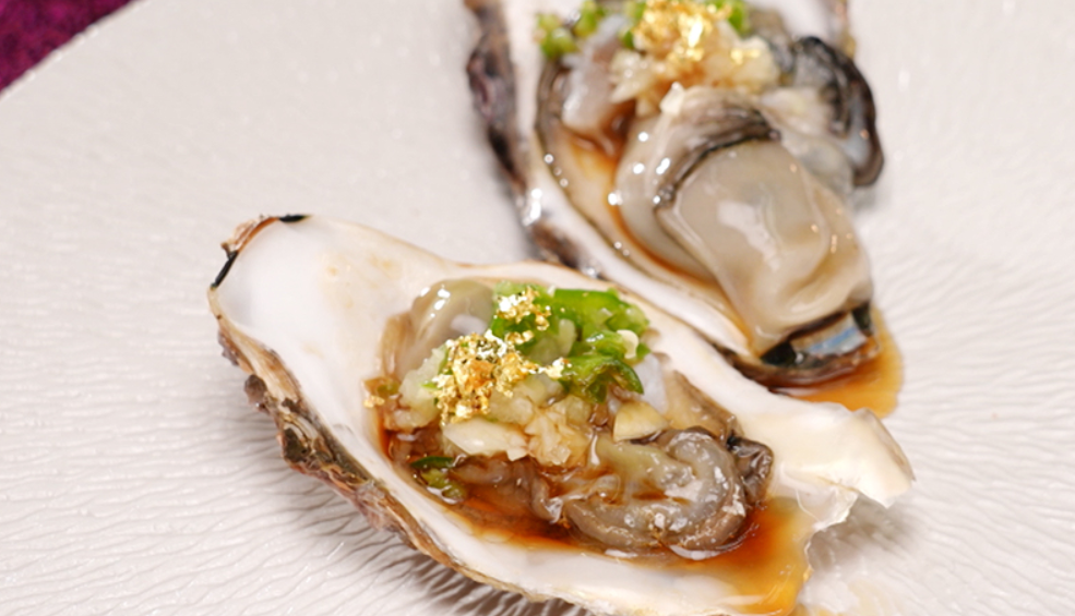 7. 굴 위에 다진 청양고추 1t, 다진마늘 1t, 참기름 1t, 만능간장 1t씩 올리고 금가루를 뿌리면 완성!
