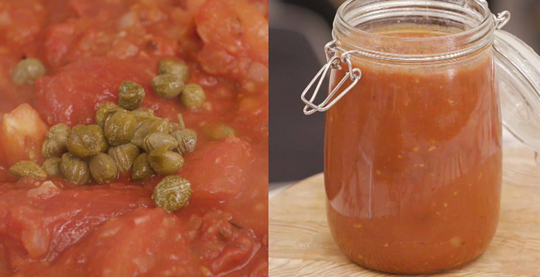 3. 케이퍼 100g, 토마토 4개, 홀토마토 1200g(한 캔), 소금, 후추를 넣고 걸쭉한 농도가 나올 때까지 졸인다.
