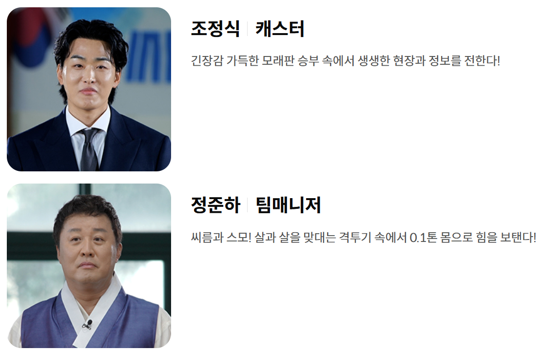 | 매니저 / 현장 지원 / 중간 조정 | 정준하 | 씨름팀 상비군 역할도 겸하며 선수들과 교감하며 방송 흐름을 돕는 역할. |