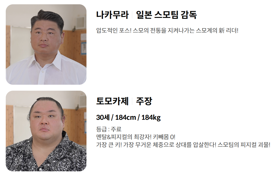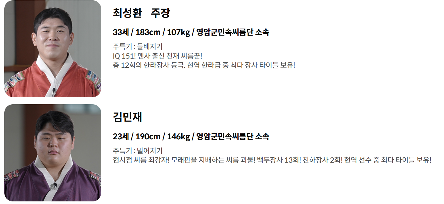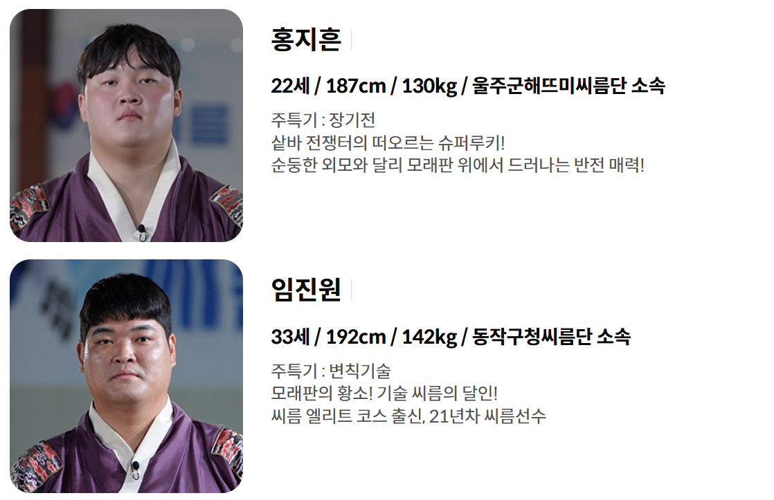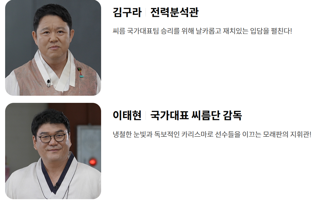 | 감독 / 스페셜 감독 | 이만기, 이태현 | 씨름 대표팀의 전략을 짜고 선수들을 이끌 감독진. 이만기는 ‘레전드’로 스페셜 역할도 수행. |