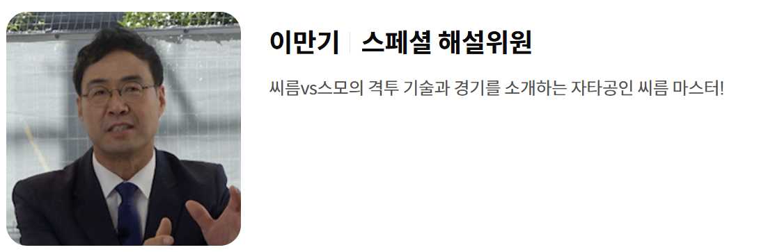 | 해설 / 전략분석관 | 김구라 | 스포츠 이해도 + 예능 감각 조합. 양국 전통 스포츠의 차이를 설명하며 분위기를 풀어갈 예정. |