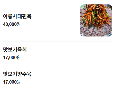 - 모듬 수육 / 아롱사태편육 / 육전 등 곁들이 메뉴 – 회식이나 소주 한 잔 하기에 좋은 메뉴들이 다양하게 제공됩니다.