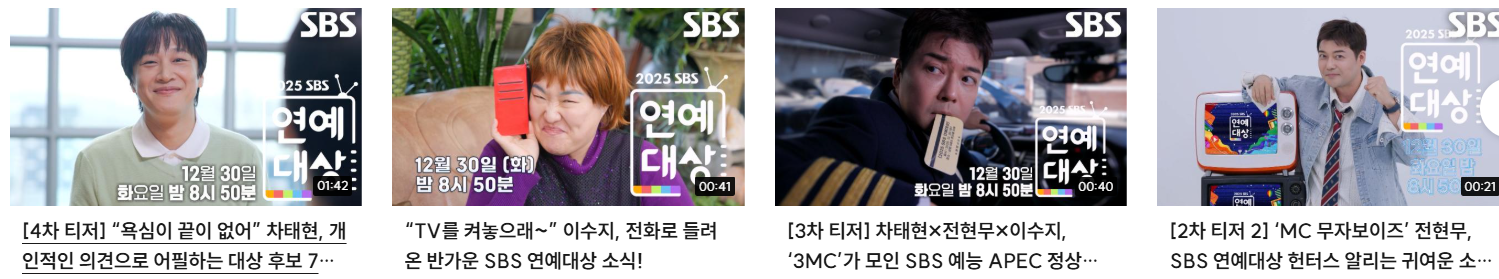 SBS는 공식적으로 2025 SBS 연예대상 대상(Grand Prize / 대상) 후보자 명단을 발표했습니다.