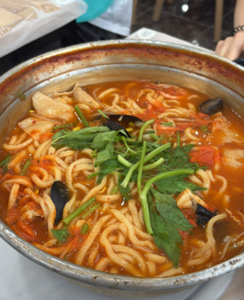 큰 냄비에 푸짐하게 나오는 칼국수 스타일이 특징입니다.
