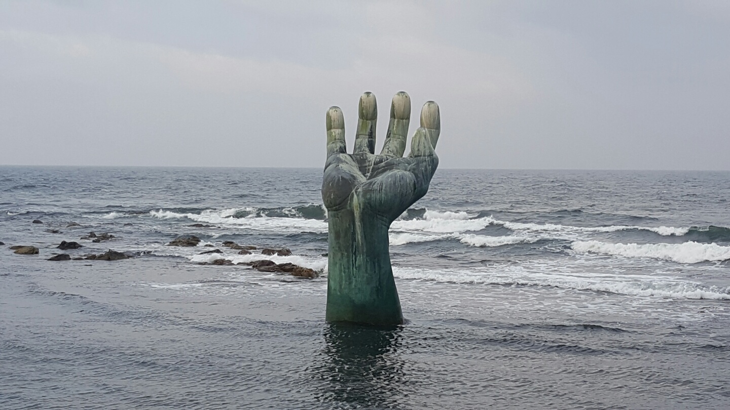 바다 위에 솟아오른 거대한 손 조형물은 호미곶의 대표 랜드마크입니다. 육지와 바다에 각각 하나씩 설치되어 있으며, 화합과 공존의 의미를 담고 있습니다.