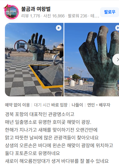 포항 여행을 계획하고 있다면, 한 번쯤은 꼭 들러야 할 대한민국 대표 일출 명소입니다. 특히 겨울철 국내 여행지나 새해 해돋이 장소를 찾고 있다면 호미곶은 후회 없는 선택이 될 것입니다.
