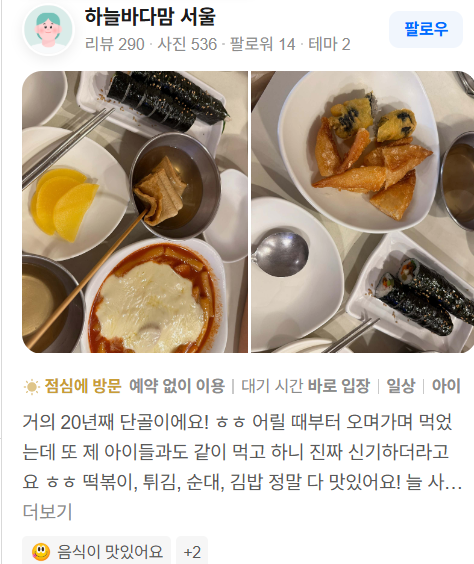 - “포장/배달 손님이 많아 바쁠 때도 있지만, 국물 떡볶이와 김밥 조합이 좋다.”