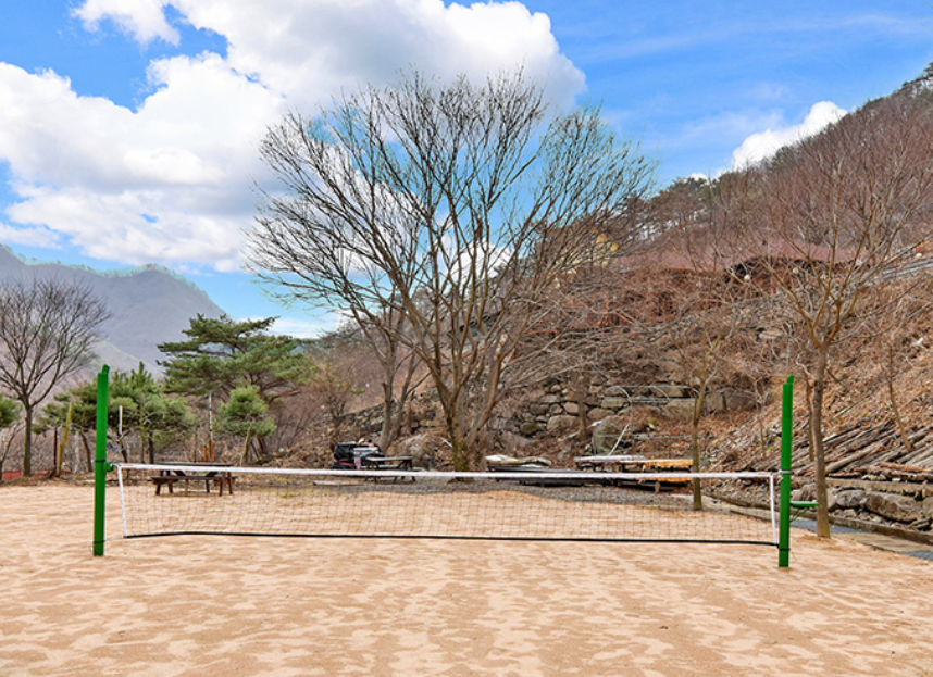 야외 족구장이 있어 운동도 즐기며 몸을 풀 수 있습니다. 단체로 오신 분들에게 특히 인기 있는 시설입니다.
