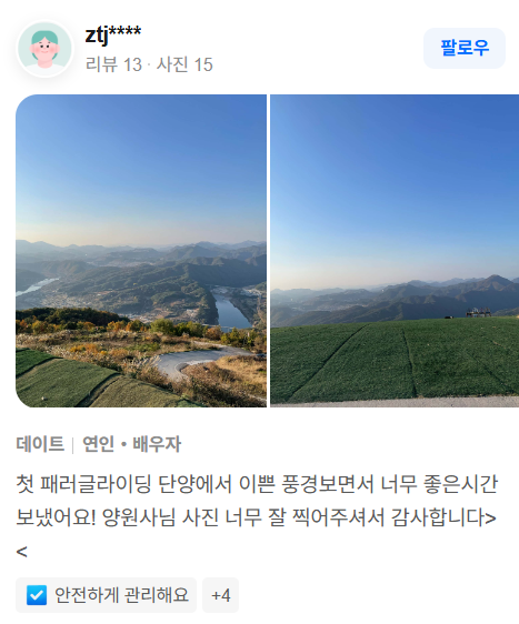 - “바람도 날씨도 너무 좋았습니다. 패러글라이딩이 저에게 버킷리스트 중 하나였는데 정말 기분이 좋았습니다.” 라는 리뷰도 남겨져 있습니다.