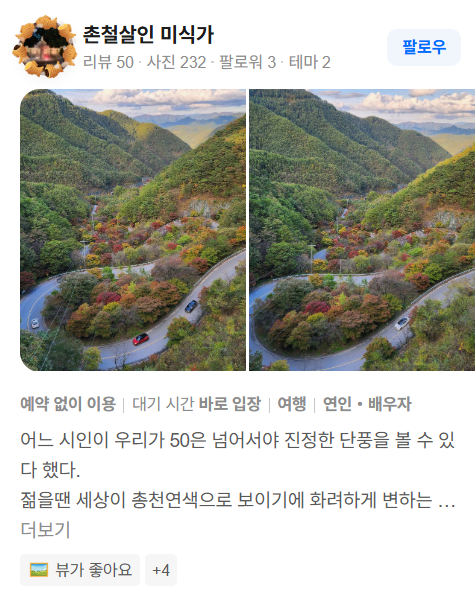• “가을 단풍 시즌에 갔는데 차도 밀리고 주차 공간도 부족했지만, 그 풍경이 다 보상해줬습니다.”