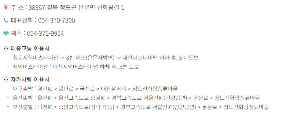 청도군 중심지에서 차량으로 이동하기 쉬운 위치에 있으며, 대구와 경산에서도 접근성이 좋아 주말 나들이 코스로 많이 방문합니다.