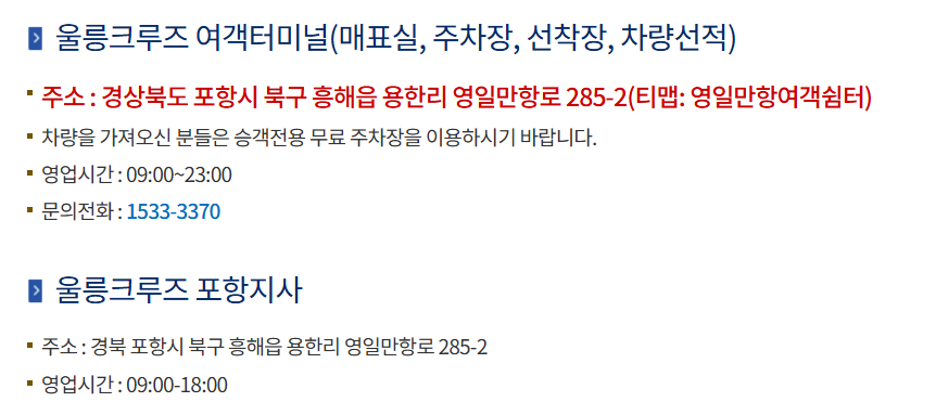 • 포항 출발 → 울릉도 도착 : 23:00 출발 → 익일 05:50 도착 (10월 1일 ~ 3월 31일 기준)