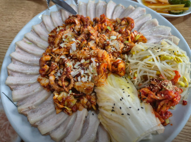 - 매콤한 낙지볶음에 부드러운 수육을 곁들인 조화로운 구성