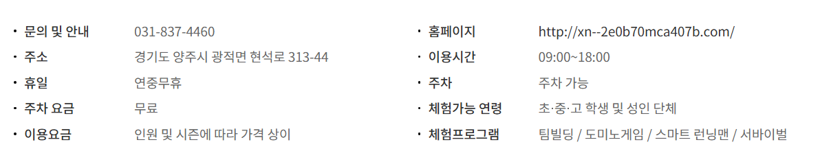 편리한 시설과 다양한 프로그램으로 도심 속에서 느껴볼 수 없는 자연과 함께하는 즐거움을 겸비한 국내 최초 최대의 유럽식 통나무 수련장으로 개설되었다고 합니다.