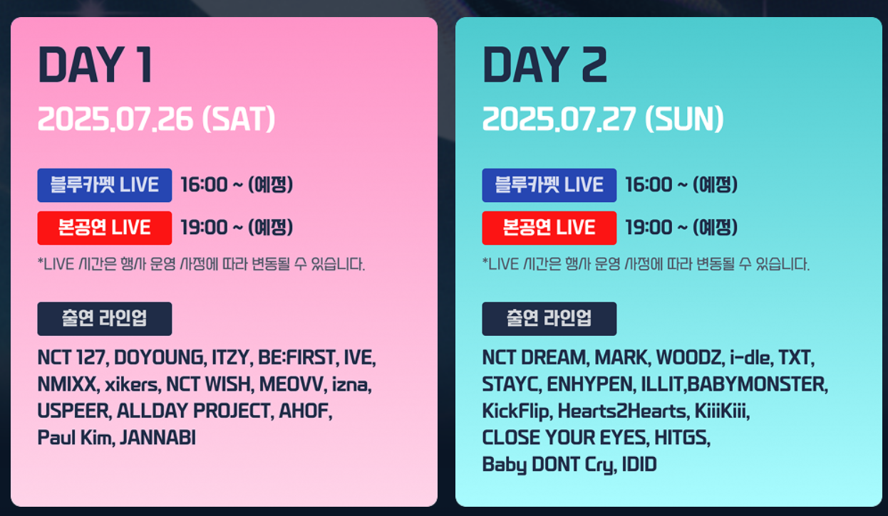 이번 행사에서는 NCT 127, ITZY, NCT DREAM, TOMORROW X TOGETHER 등 다양한 아티스트들이 화려한 무대를 선보일 예정입니다.