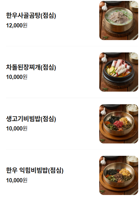 - 익비/생고기비빔밥/차돌된장찌개 10,000원 - 한우곰탕 12,000원
