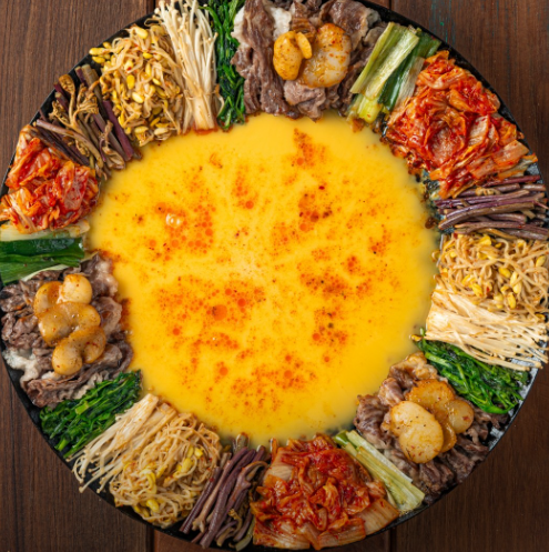 한우 차돌박이 구절판은 1++ 한우 차돌박이와 키조개관자, 미나리, 팽이버섯, 대파, 콩나물, 고사리 등 다양한 재료를 원형으로 배치하여 구워내는 요리입니다.
