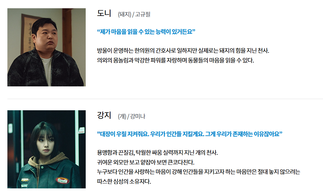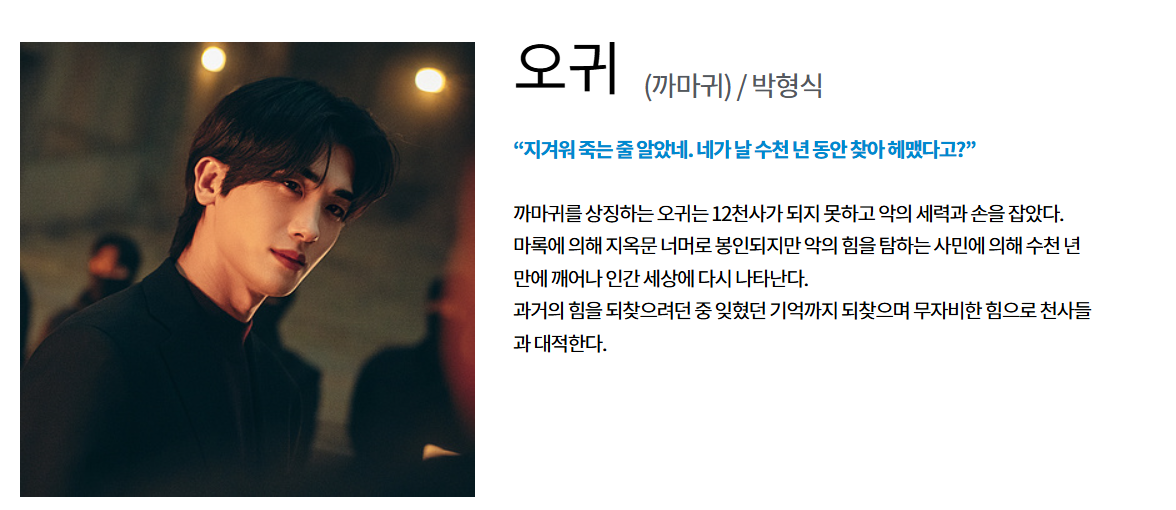 오귀 (까마귀 악귀) 박형식 봉인된 악귀이자 주요 빌런. 천사들과 대립 구도를 형성