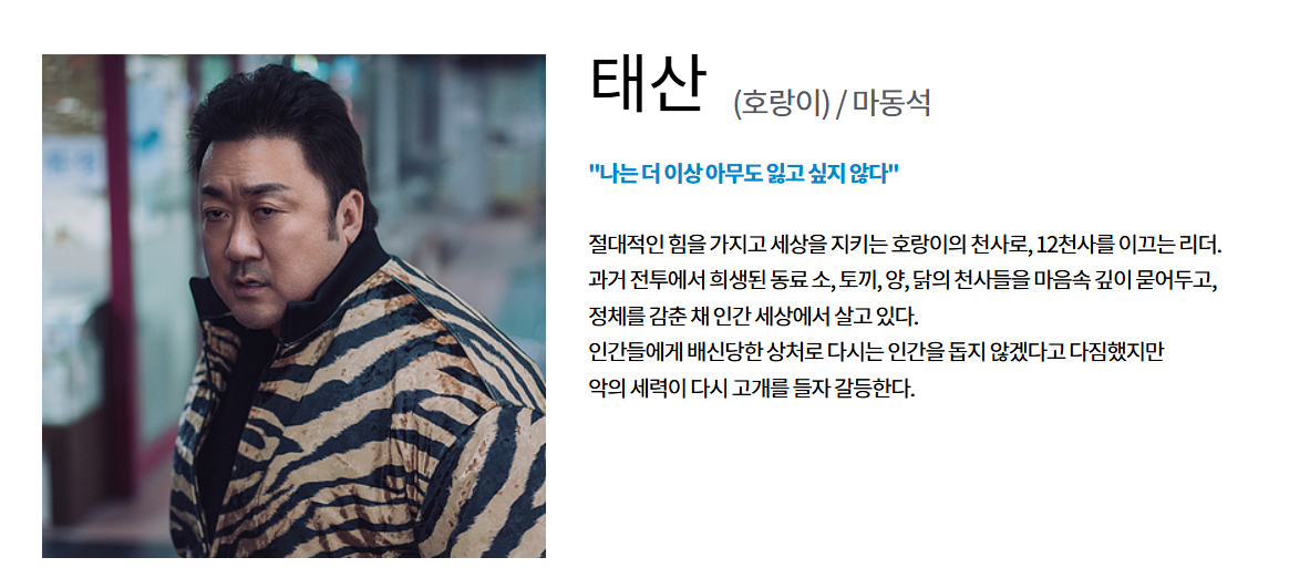 태산 (호랑이 천사, 리더) 마동석 12천사의 리더. 과거 전투로 동료들을 잃고 책임감을 안고 살아감
