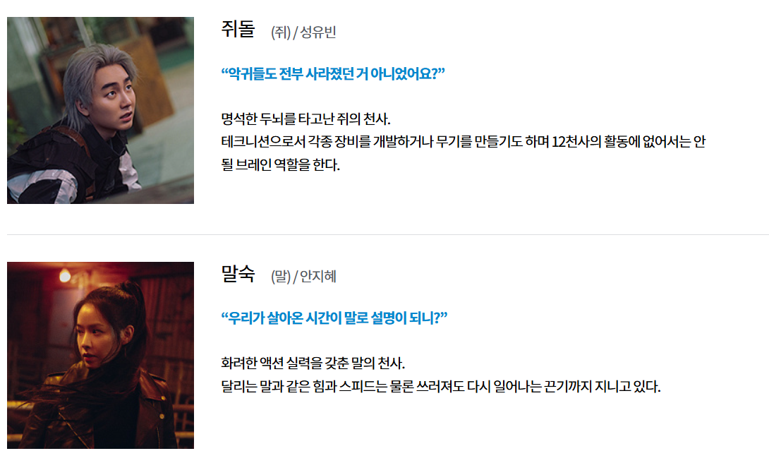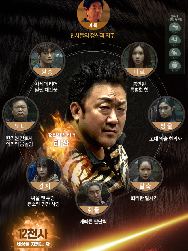 태산 (호랑이 천사, 리더) 마동석 12천사의 리더. 과거 전투로 동료들을 잃고 책임감을 안고 살아감