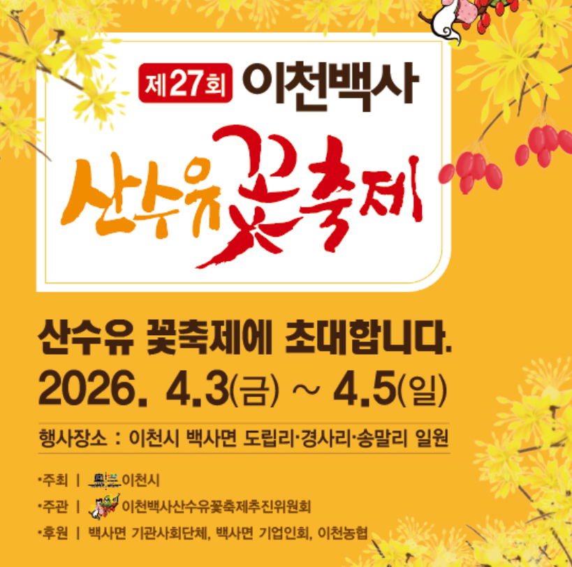 이천 백사 산수유꽃축제 2026 | 경기도 봄꽃 여행 대표 명소