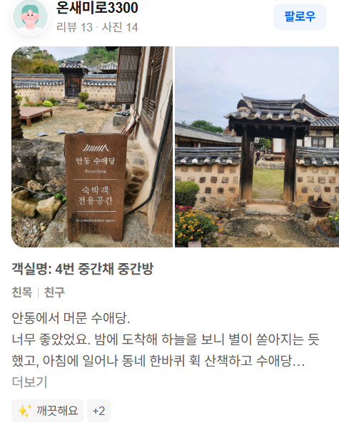 다음 안동 여행에서는 수애당 한옥스테이를 고려해 보시기 바랍니다.