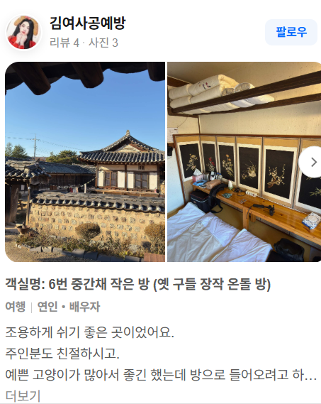 - “한옥 분위기가 정말 아름답고 조용해서 힐링하기 좋았다.”