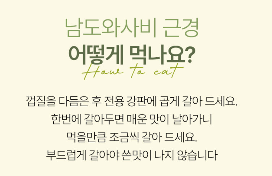 일반 유통 와사비와 비교하면 향의 지속력과 매운맛의 깊이가 확연히 다릅니다.