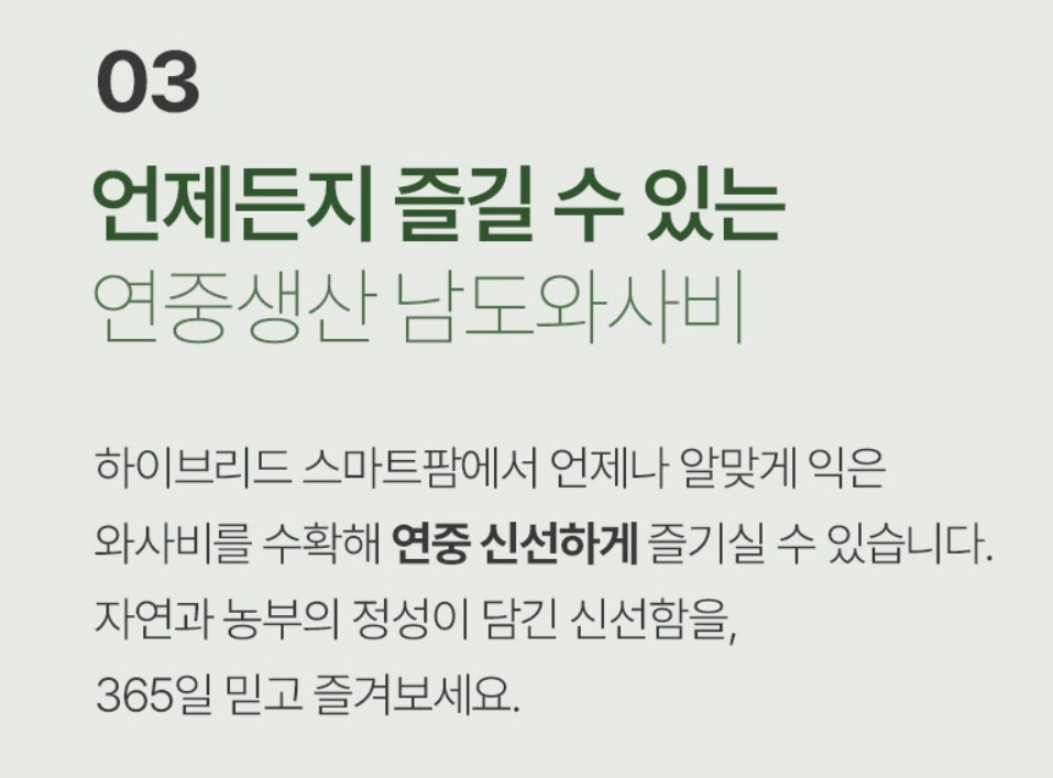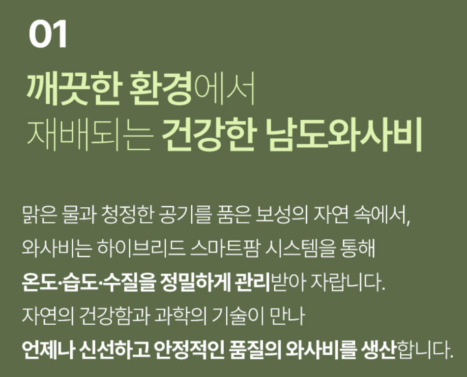 전남 보성에서 재배되는 **고추냉이(생와사비)**는 깨끗한 자연환경과 스마트팜 시스템을 통해 생산되는 프리미엄 농산물입니다.