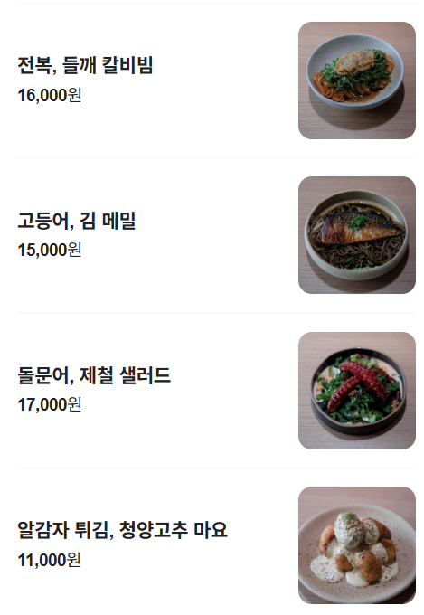 - “전복 들깨 칼비빔, 맵지 않아 누구나 편하게 즐길 수 있음. 물도 정말 맛있어서 추가 음료 없이 만족했다”